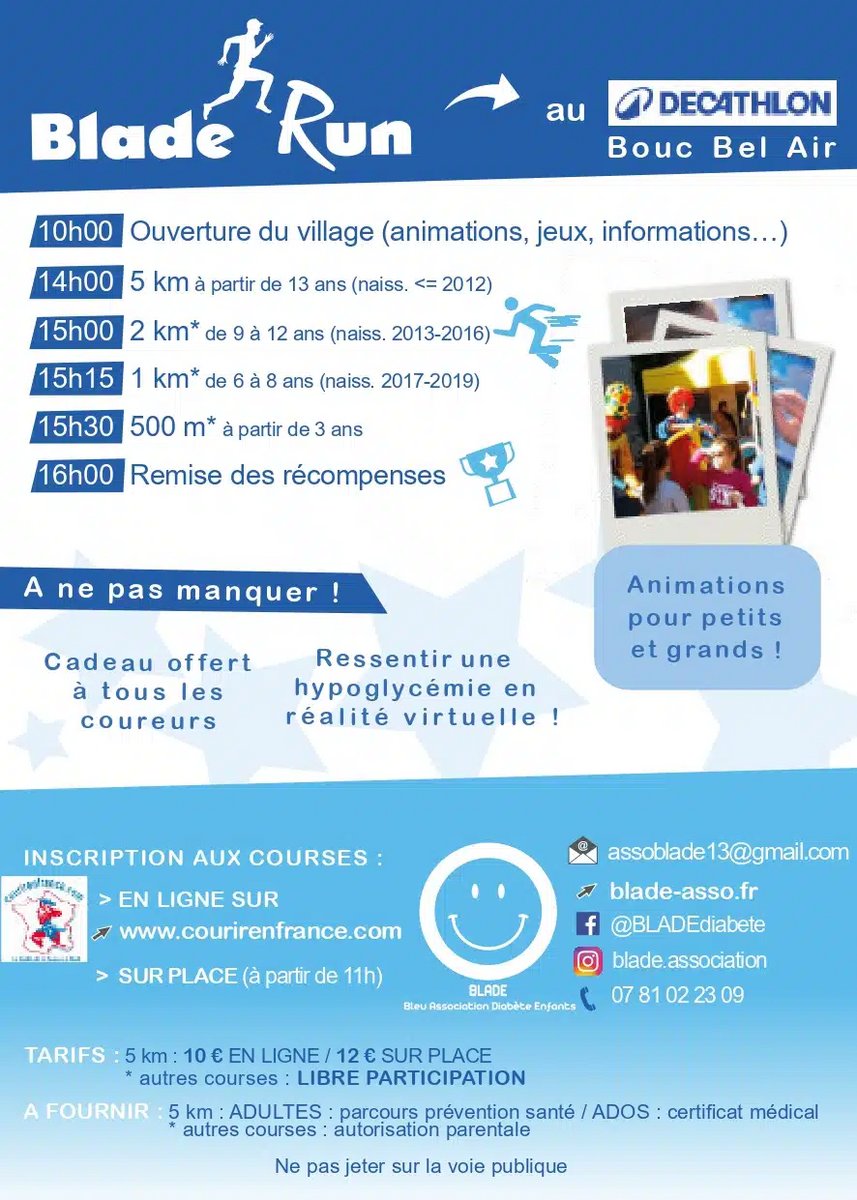 - Inscription possible sur place, Tarif 12 euros, [non inscrits et pré-inscrits non payés] à partir de 11h00 village Décathlon de Bouc Bel Air.